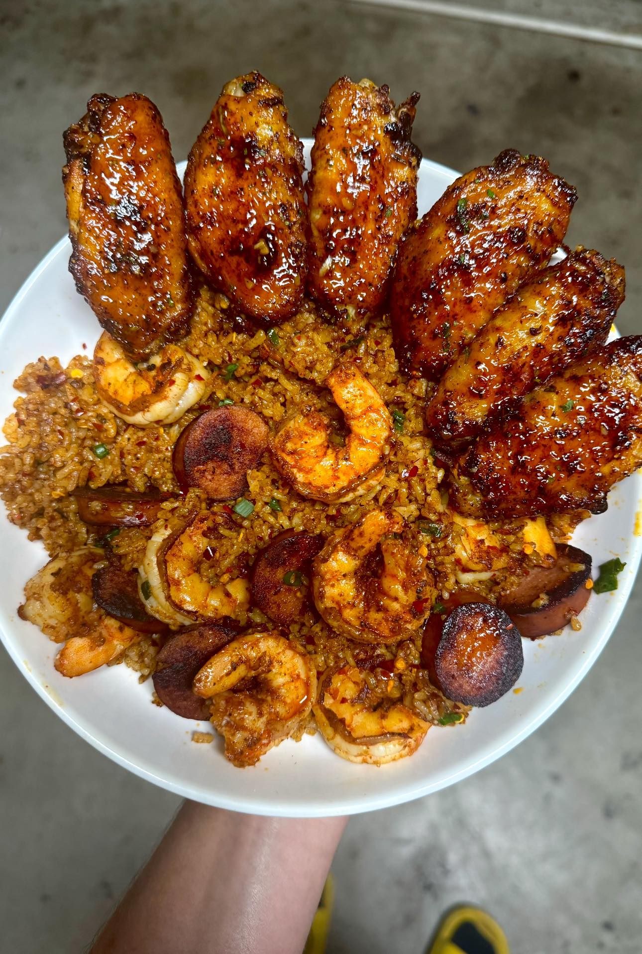 Cajun Shrimp & Sausage Fried Rice with Crispy Wings