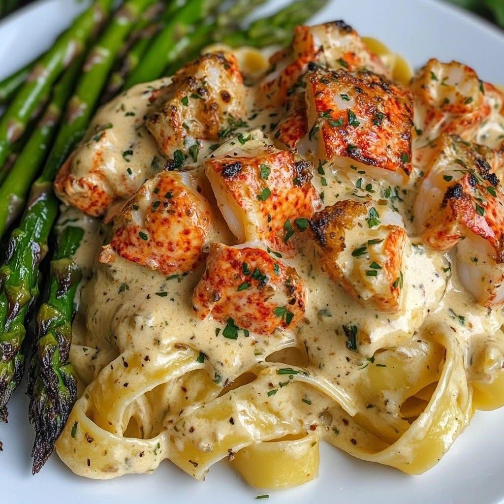 Indulge in a restaurant-quality seafood dinner right at home with this Creamy Lobster Tail Pasta. Tender lobster meat, lightly seared and packed with flavor, pairs perfectly with fettuccine coated in a velvety Parmesan cream sauce. Freshly grilled asparagus adds a crisp, green contrast, making this dish elegant, comforting, and perfect for special occasions or a luxurious weeknight treat. With simple steps and high-impact flavors, it’s seafood sophistication made easy.