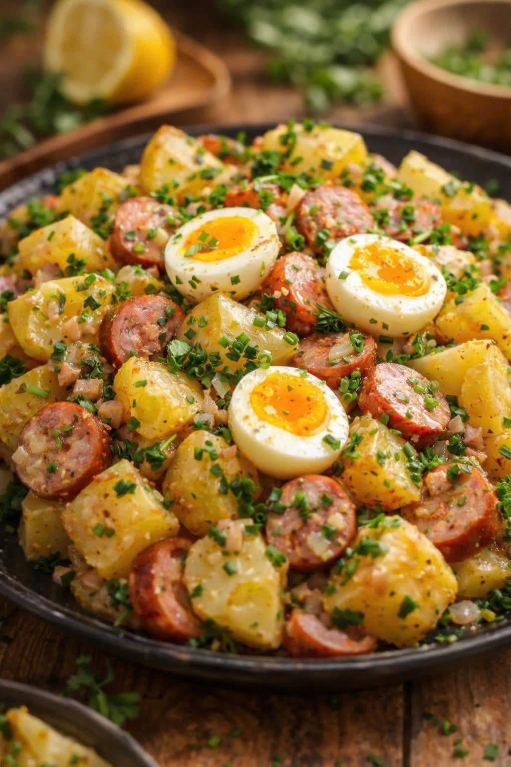 German Salad is the perfect combination of hearty, creamy, and crisp—all in one bowl. This potato-based salad is refreshing yet filling, making it a versatile dish for warm-weather lunches, family dinners, or picnic spreads. Tender potatoes, savory Frankfurt sausages, crisp vegetables, and a creamy mustard-mayo dressing come together for a balance of textures and flavors. It’s easy to prepare, comforting, and quick enough for a weeknight meal yet elegant enough to serve at casual gatherings.