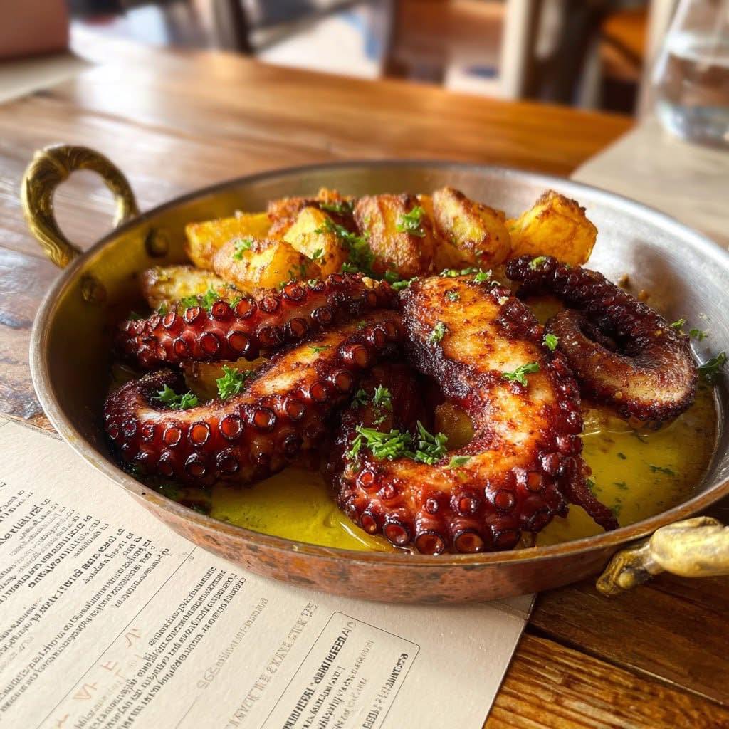 Experience the ultimate seafood indulgence with this Grilled Octopus dish, paired with golden, crispy potatoes and a tangy, creamy lemon sauce. The octopus is tenderized through gentle simmering, then char-grilled for a smoky, caramelized exterior. Paired with paprika-spiced potatoes and a luscious, zesty sauce, this recipe combines textures and flavors that are both elegant and comforting—a true restaurant-quality experience at home.