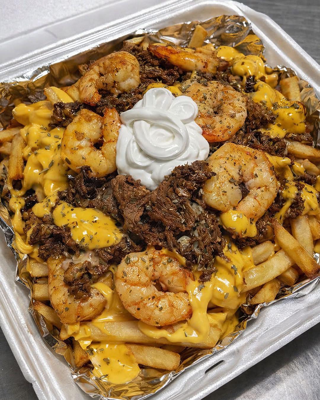 Loaded Fries Topped with Shrimp & Steak Goodness