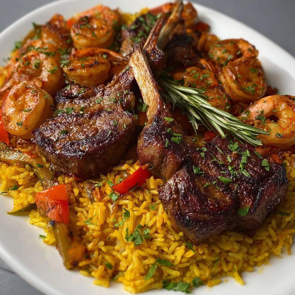 Experience the ultimate indulgence with this Luxury Surf & Turf featuring tender lamb chops paired with succulent garlic butter shrimp, served over a fragrant, golden rice pilaf. This dish is a celebration of flavors—herbaceous, buttery, and slightly smoky—with a visually stunning presentation that feels like a five-star restaurant meal in your own kitchen. Perfect for special occasions, date nights, or anytime you want to impress with an elegant and satisfying seafood-and-meat feast.