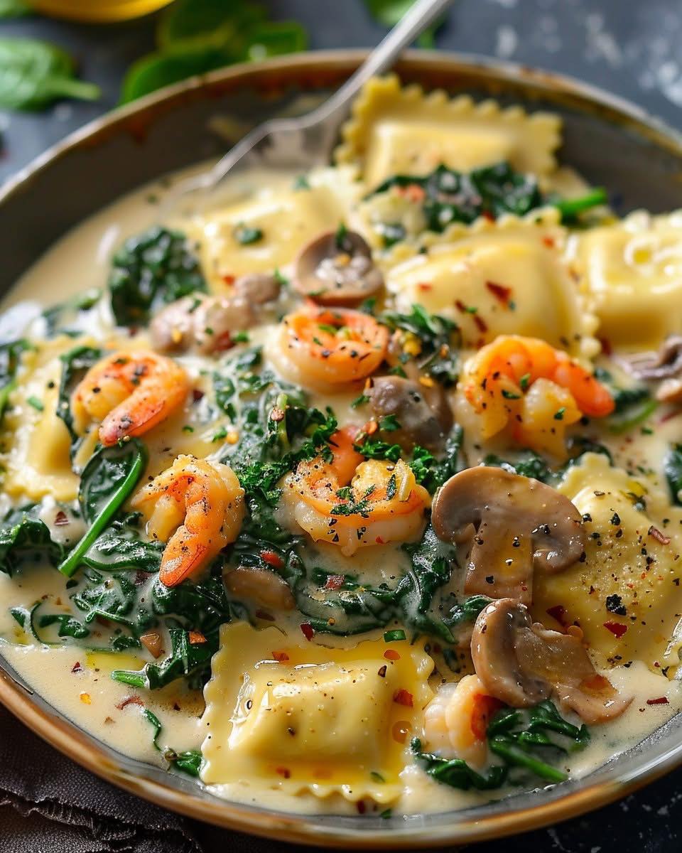 Ravioli with Seafood, Spinach & Mushrooms in Garlic Cream Sauce 🍴🦐🍄🌿