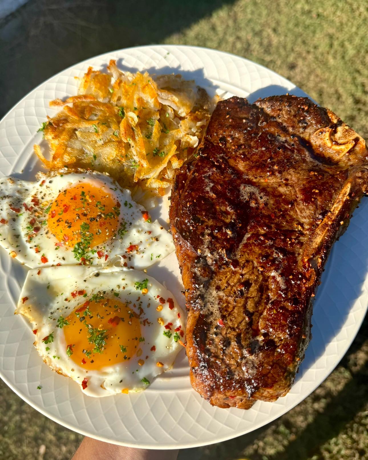 Start your day with a breakfast that truly satisfies: a perfectly seared strip steak, golden crispy hashbrowns, and rich, runny fried eggs. This classic morning combo blends savory, hearty flavors with textures that are both crispy and tender. Whether it’s a leisurely weekend brunch or a power breakfast before a busy day, this plate delivers a filling, flavorful, and indulgent start to your morning.