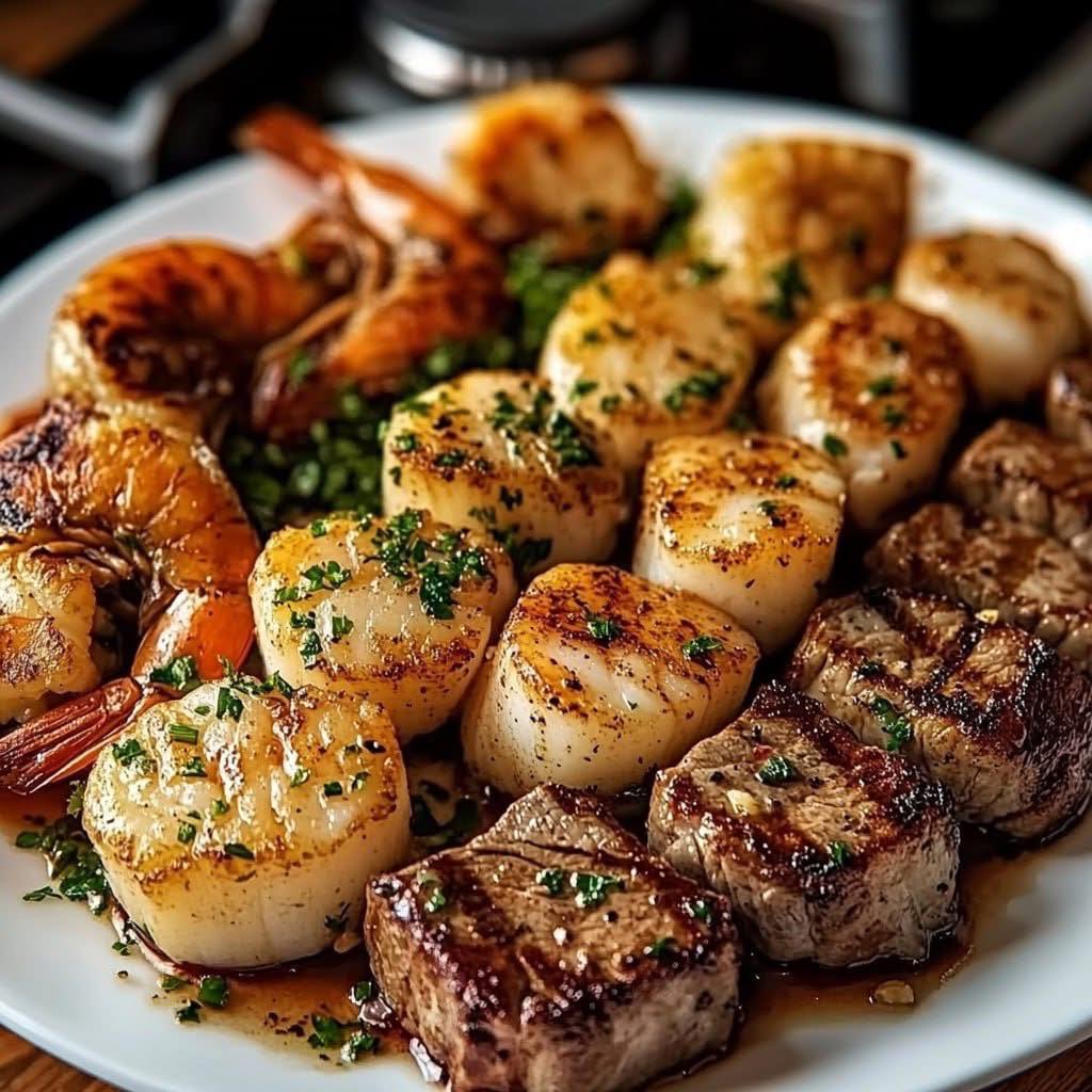 Elevate your dinner with this stunning Surf & Turf Platter featuring juicy steak bites, perfectly seared shrimp, and golden scallops, all kissed with a fragrant garlic herb butter. This dish combines the best of land and sea on a single plate, creating a luxurious, restaurant-style experience right at home. Perfect for date nights, special occasions, or anytime you want to impress, each bite bursts with rich, savory flavor and buttery indulgence.